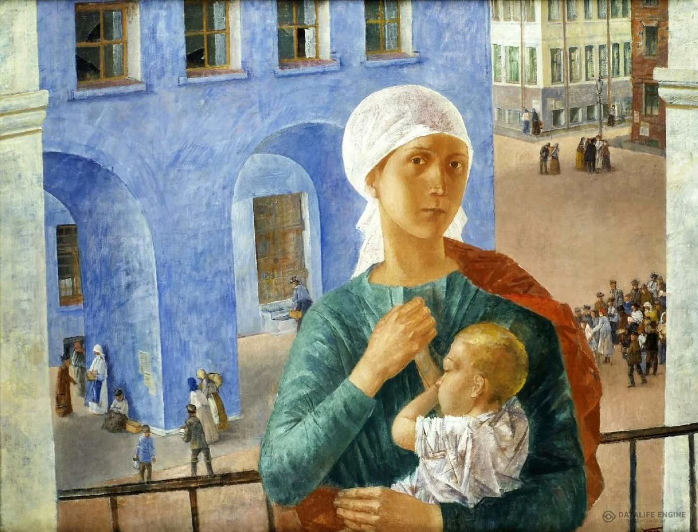 Картина показывает городскую сцену в послереволюционном Петрограде (ныне Санкт-Петербург). Художник использует геометрические формы и контрастные цвета, создавая сложную, но гармоничную композицию. По центру расположена мать с ребенком, которую позже назовут «Петроградская мадонна». В этом произведении отражены изменения в общественной и культурной жизни страны.