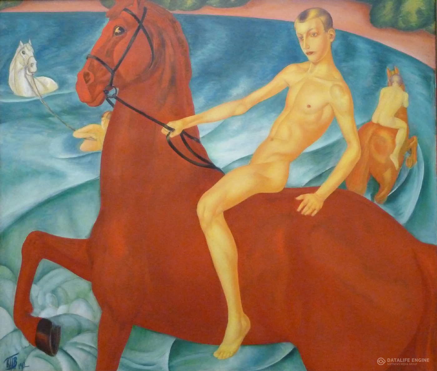 «Купание красного коня» (1912) принесло художнику мировую известность. Картина вызвала неоднозначные трактовки: символ России, которую ведет юноша, или предсказание коммунистического будущего. Сам Петров-Водкин задумывал ее в бытовом жанре.